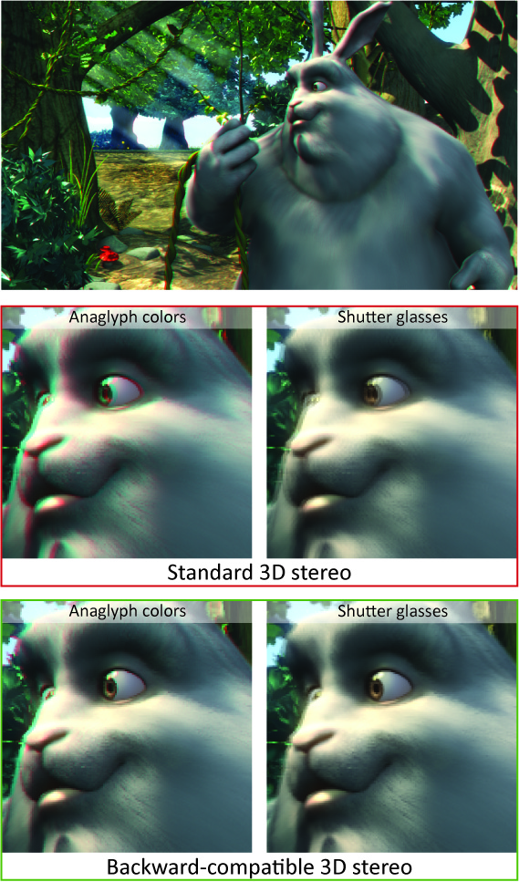 Backward-compatible stereo which introduces disparities only where they are needed. This allows content to be produced that appears almost ordinary to a viewer without stereo equipment and conveys a 3D impression when such equipment is used. “Big Buck Bunny" © by Blender Foundation