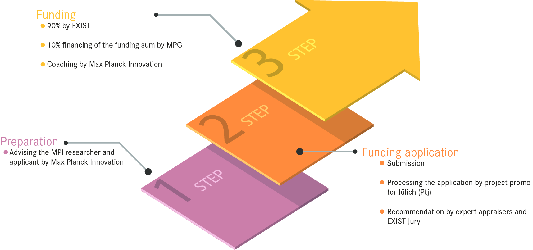The team at Max Planck Innovation has already successfully supported start-up projects for many years in their application for an EXIST Transfer of Research grant and is well acquainted with the application process. The application is only comparable with ‘conventional’ research applications to a limited extent, and above all, presupposes company- and market-related considerations. As early as possible a preparation of the application is therefore urgently recommended. Please involve Max Planck Innovation as early as possible and allow for at least two months for the application processing and corresponding preliminary work.